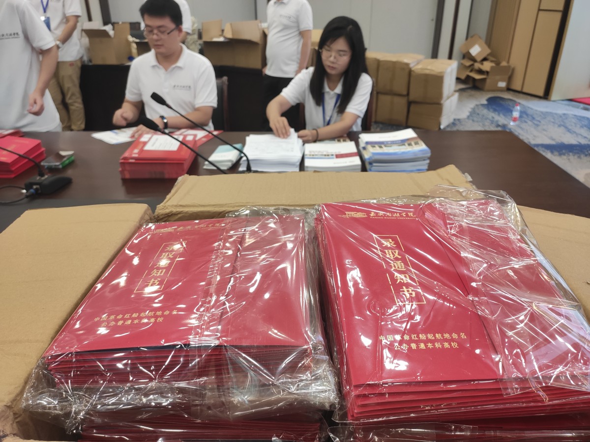 7月28日下午3点,嘉兴南湖学院2021录取通知书的封面送到了学校,招生办的负责人正在加紧封装录取通知书。在中国共产党成立百年之际,以革命红船起航地命名的高等学府嘉兴南湖学院也精心设计了今年的录取通知书。